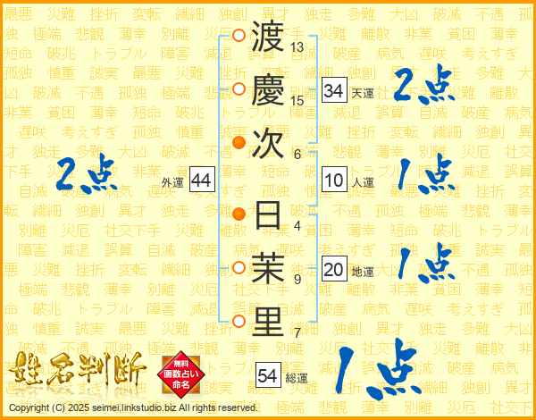 渡(13画)慶(15画)次(6画) 日(4画)茉(9画)里(7画)
