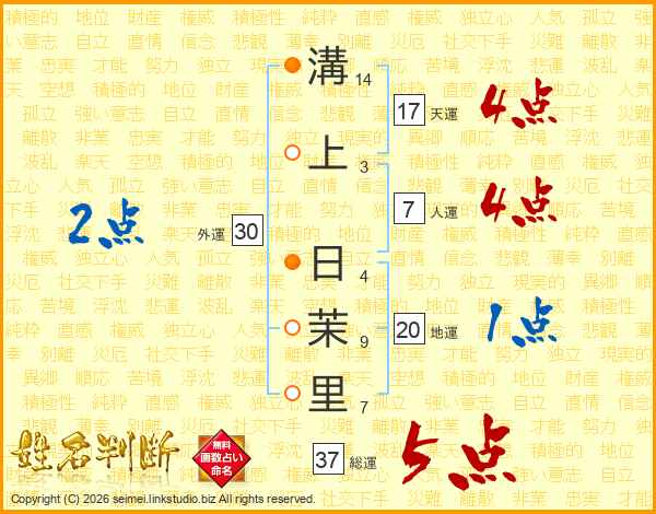 溝(14画)上(3画) 日(4画)茉(9画)里(7画)
