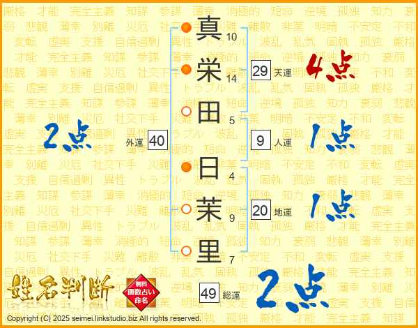 真(10画)栄(14画)田(5画) 日(4画)茉(9画)里(7画)