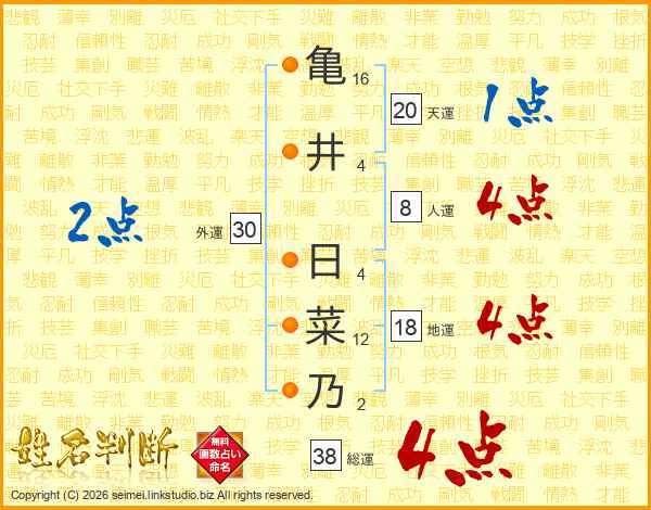 亀(16画)井(4画) 日(4画)菜(12画)乃(2画)