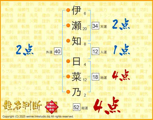 伊(6画)瀬(20画)知(8画) 日(4画)菜(12画)乃(2画)