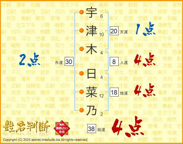 宇(6画)津(10画)木(4画) 日(4画)菜(12画)乃(2画)