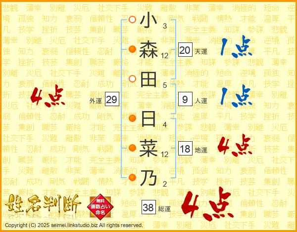 小(3画)森(12画)田(5画) 日(4画)菜(12画)乃(2画)