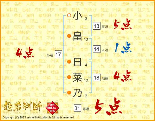 生活面を象徴する運勢です。外部から受ける影響力を表し、結婚運、家庭運や職場、環境への順応性を表します。総運から人運を引いた画数。姓や名が1文字の場合を除く。
