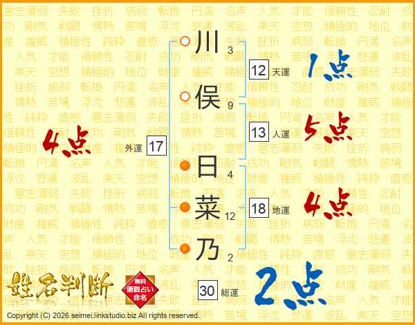 生活面を象徴する運勢です。外部から受ける影響力を表し、結婚運、家庭運や職場、環境への順応性を表します。総運から人運を引いた画数。姓や名が1文字の場合を除く。