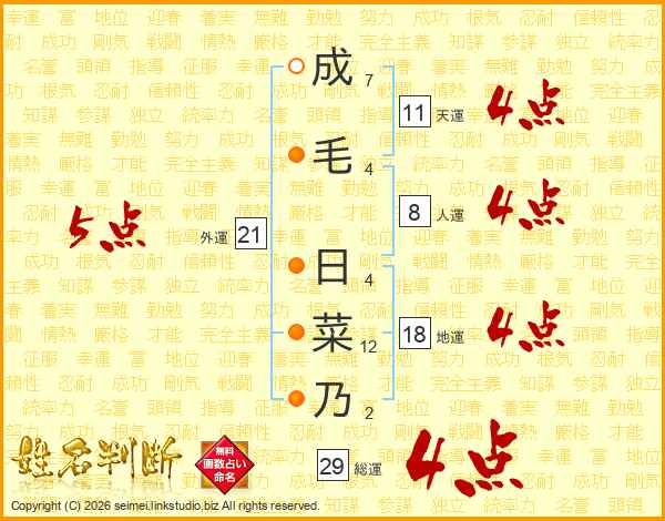 成(7画)毛(4画) 日(4画)菜(12画)乃(2画)
