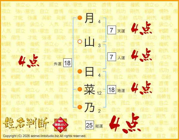 月(4画)山(3画) 日(4画)菜(12画)乃(2画)
