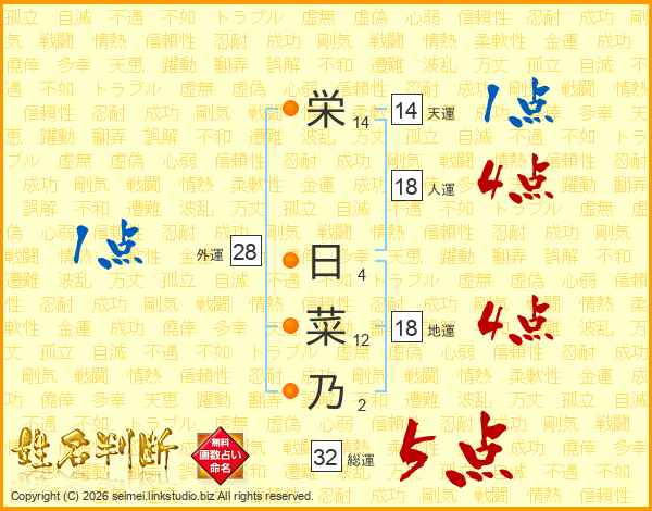 栄(14画) 日(4画)菜(12画)乃(2画)