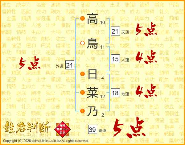 高(10画)鳥(11画) 日(4画)菜(12画)乃(2画)