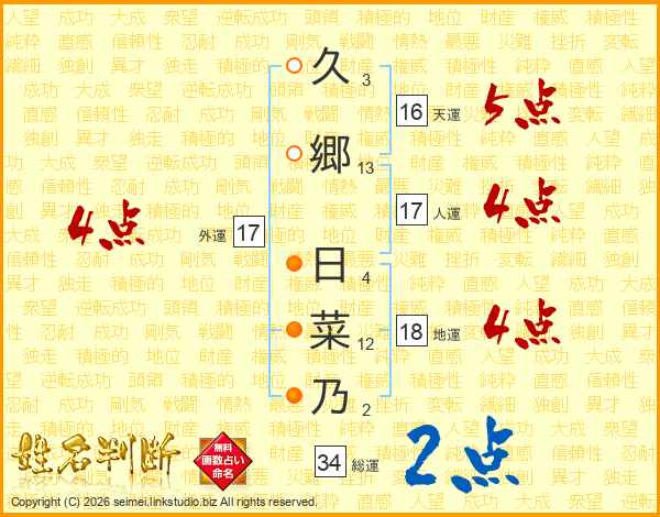 久(3画)郷(13画) 日(4画)菜(12画)乃(2画)