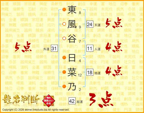東風谷日菜乃さんの外運は31画の5点!