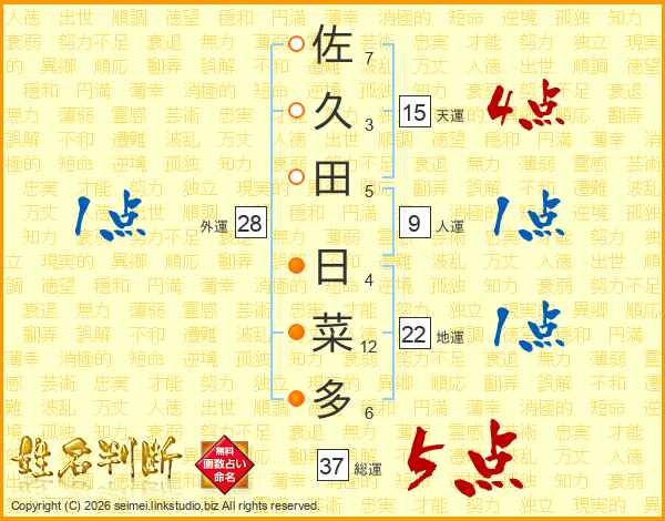 佐久田日菜多さんの総運は37画の5点!