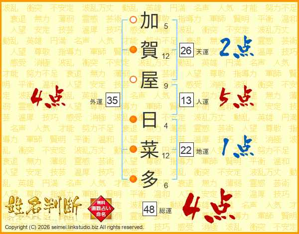 加賀屋日菜多さんの総運は48画の4点!