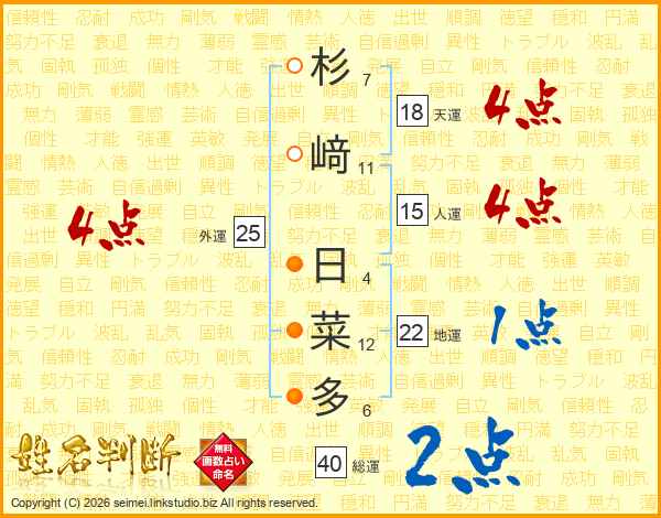 杉(7画)﨑(11画) 日(4画)菜(12画)多(6画)