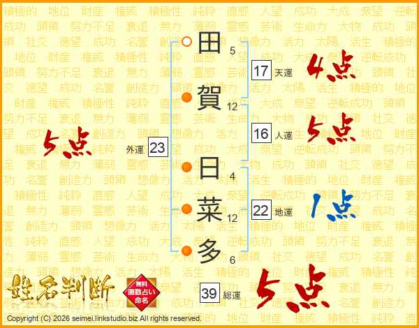 田賀日菜多さんの総運は39画の5点!