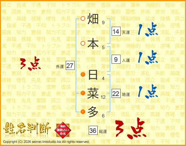 畑本日菜多さんの天運は14画の1点!