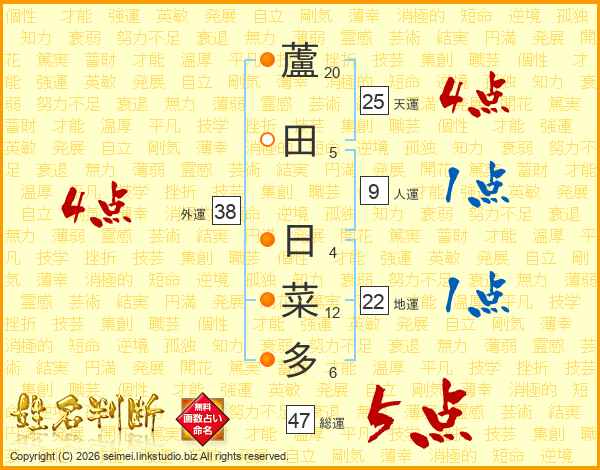 蘆(20画)田(5画) 日(4画)菜(12画)多(6画)