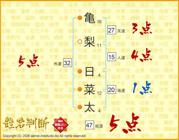 亀(16画)梨(11画) 日(4画)菜(12画)太(4画)