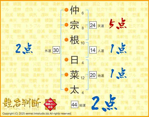 仲(6画)宗(8画)根(10画) 日(4画)菜(12画)太(4画)