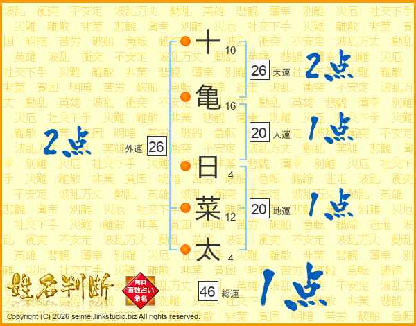 十(10画)亀(16画) 日(4画)菜(12画)太(4画)