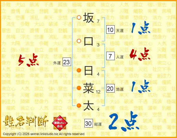 坂(7画)口(3画) 日(4画)菜(12画)太(4画)