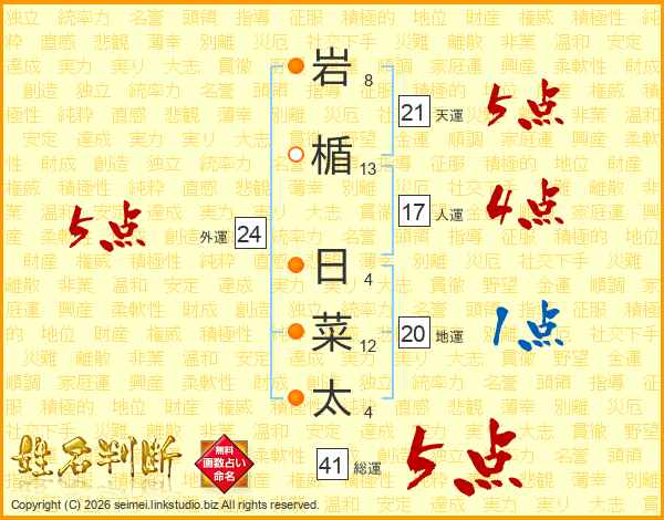 岩楯日菜太さんの総運は41画の5点!