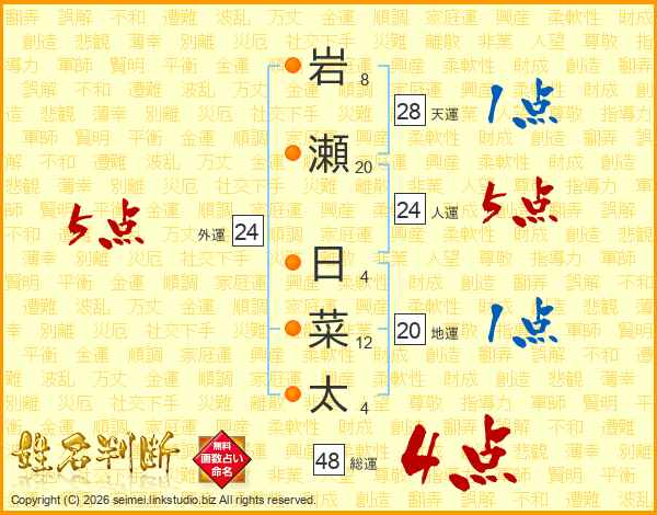 岩(8画)瀬(20画) 日(4画)菜(12画)太(4画)