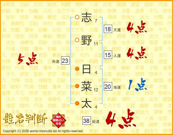 志(7画)野(11画) 日(4画)菜(12画)太(4画)