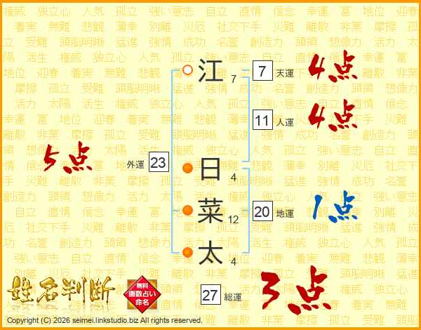 生活面を象徴する運勢です。外部から受ける影響力を表し、結婚運、家庭運や職場、環境への順応性を表します。総運から人運を引いた画数。姓や名が1文字の場合を除く。