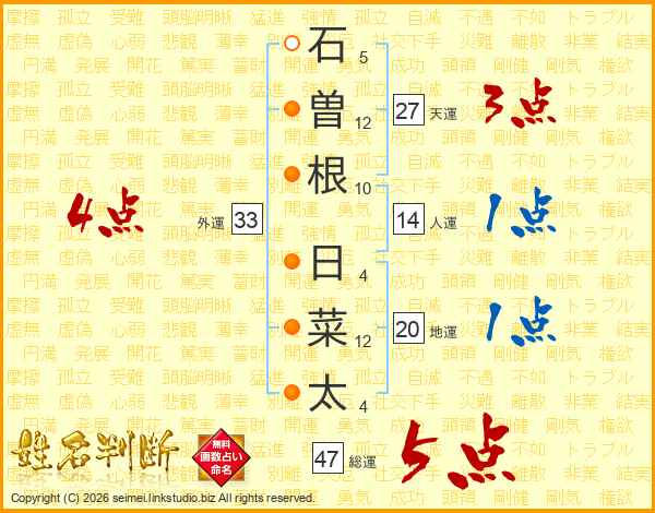 石(5画)曽(12画)根(10画) 日(4画)菜(12画)太(4画)