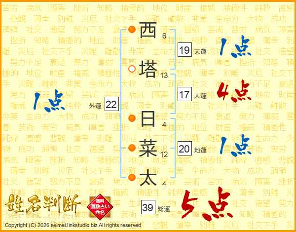 西塔日菜太さんの総運は39画の5点!