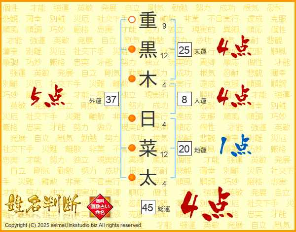 重黒木日菜太さんの総運は45画の4点!
