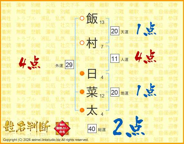 飯村日菜太さんの人運は11画の4点!