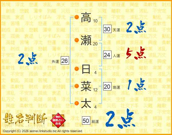 高(10画)瀬(20画) 日(4画)菜(12画)太(4画)