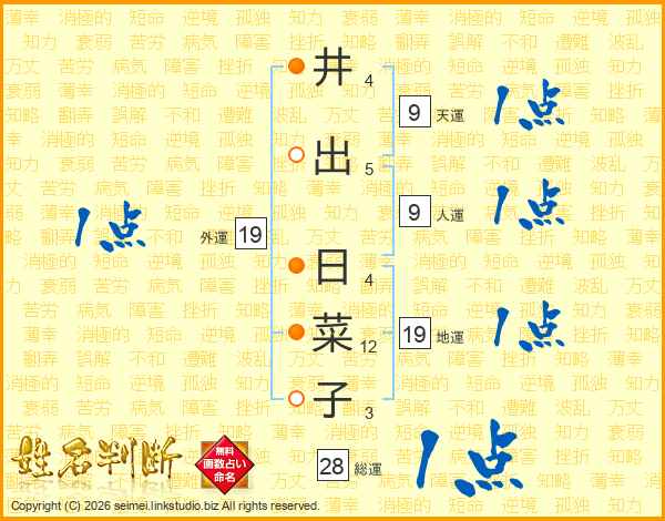 井(4画)出(5画) 日(4画)菜(12画)子(3画)