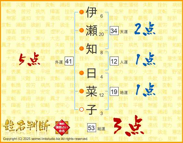 伊(6画)瀬(20画)知(8画) 日(4画)菜(12画)子(3画)