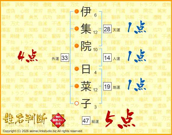 伊(6画)集(12画)院(10画) 日(4画)菜(12画)子(3画)