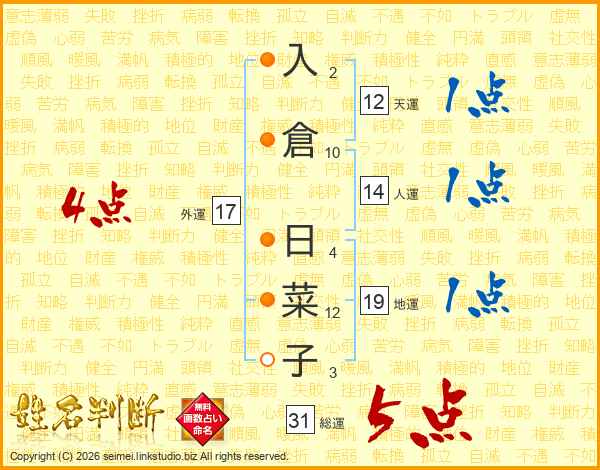 入(2画)倉(10画) 日(4画)菜(12画)子(3画)