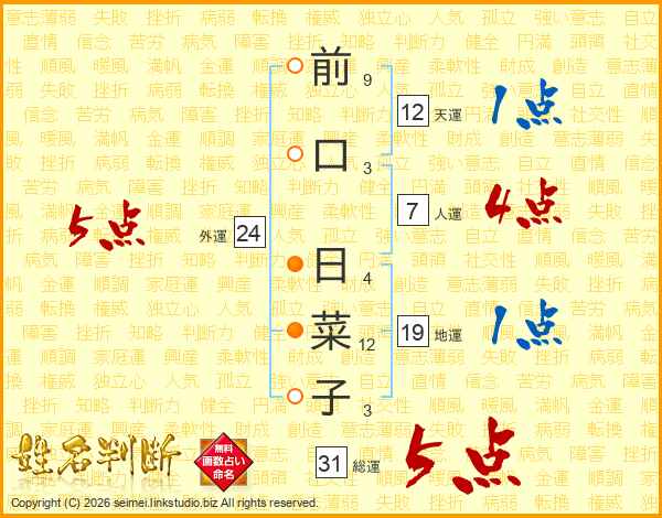 前(9画)口(3画) 日(4画)菜(12画)子(3画)