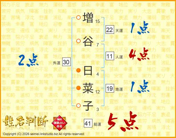 増(15画)谷(7画) 日(4画)菜(12画)子(3画)