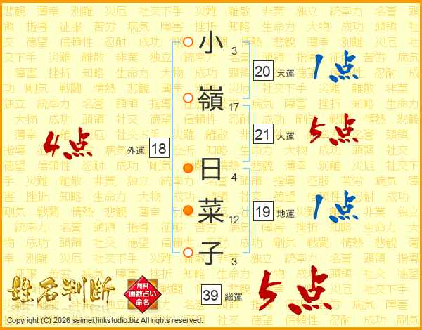 小(3画)嶺(17画) 日(4画)菜(12画)子(3画)