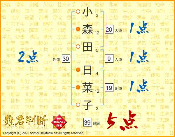 小(3画)森(12画)田(5画) 日(4画)菜(12画)子(3画)