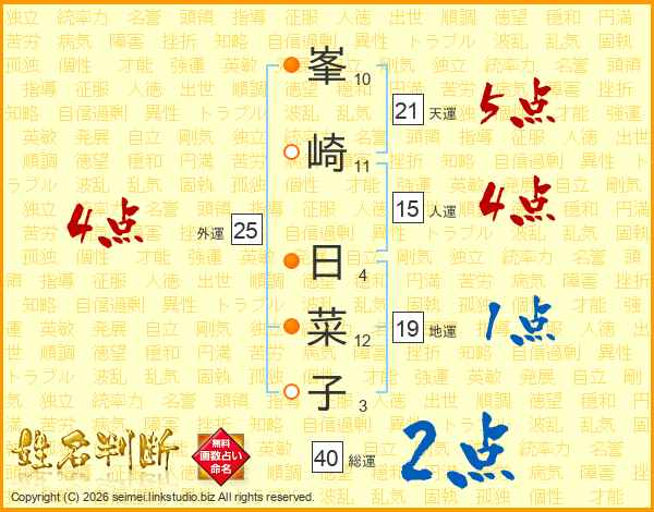 峯(10画)崎(11画) 日(4画)菜(12画)子(3画)