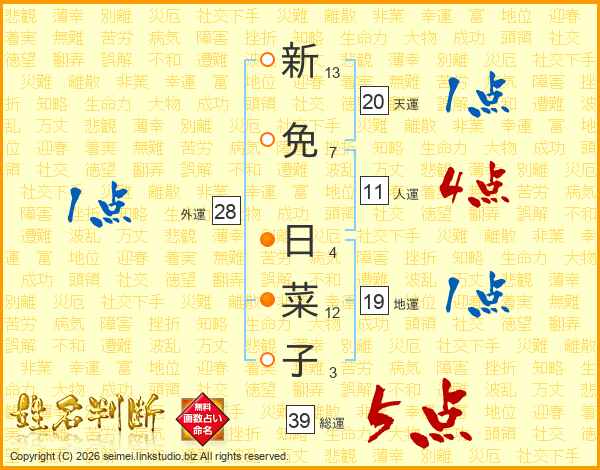 新免日菜子さんの総運は39画の5点!