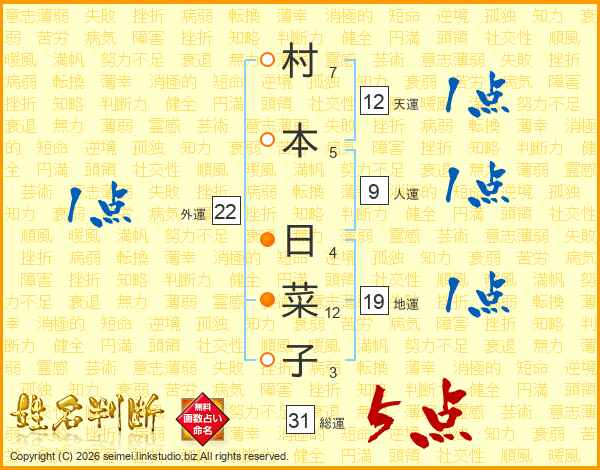村(7画)本(5画) 日(4画)菜(12画)子(3画)