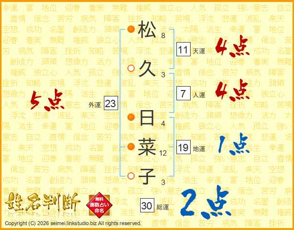 松(8画)久(3画) 日(4画)菜(12画)子(3画)