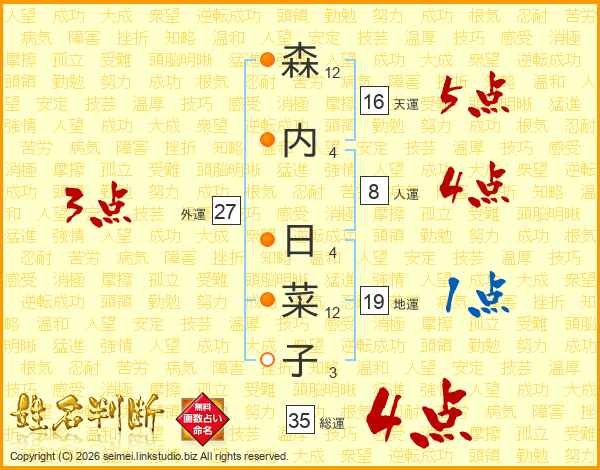 森(12画)内(4画) 日(4画)菜(12画)子(3画)