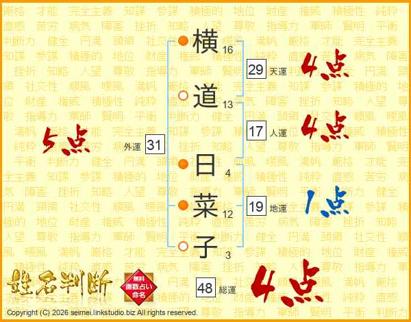 横(16画)道(13画) 日(4画)菜(12画)子(3画)