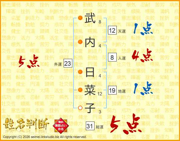 武(8画)内(4画) 日(4画)菜(12画)子(3画)