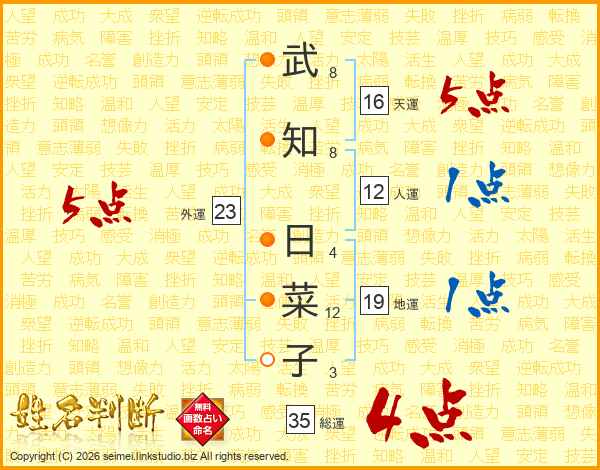 武(8画)知(8画) 日(4画)菜(12画)子(3画)